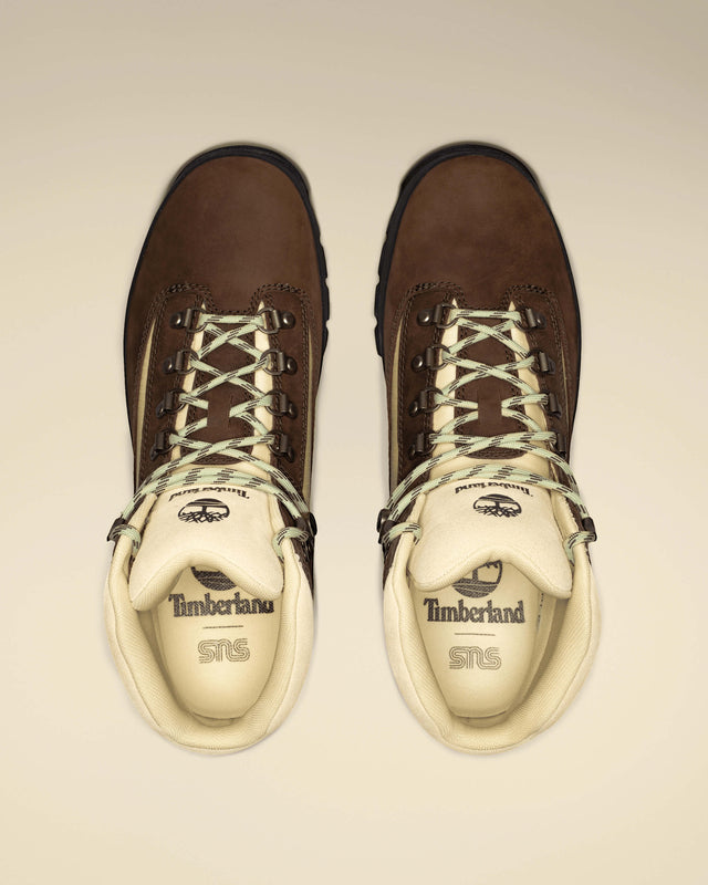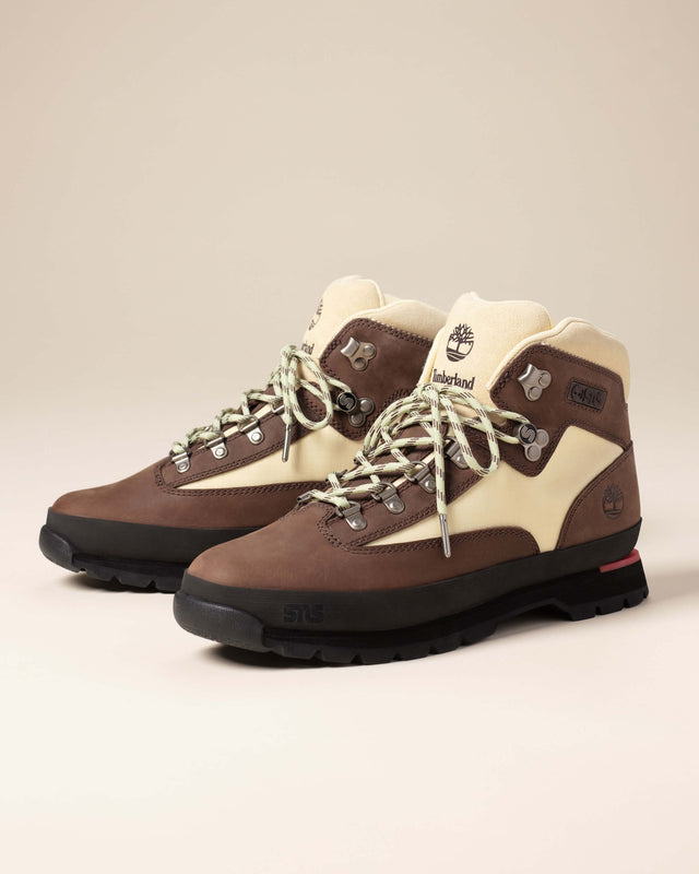 Crafted with nylon ripstop and suede materials, the SNS x Timberland Euro Hiker brings Meatballs and Mash to life through rich cream and brown tones across the upper, while the green rope laces and red heel tab reference lingonberries and pressed cucumber, adding an extra pop of color to the Swedish-inspired dish. Finishing touches include a custom hang tag, co-branded logos on the tongue label, ankle collar, lateral sidewall, and insole atop a grippy rubber outsole.