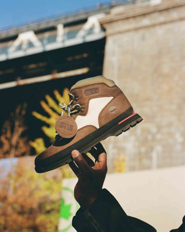Crafted with nylon ripstop and suede materials, the SNS x Timberland Euro Hiker brings Meatballs and Mash to life through rich cream and brown tones across the upper, while the green rope laces and red heel tab reference lingonberries and pressed cucumber, adding an extra pop of color to the Swedish-inspired dish. Finishing touches include a custom hang tag, co-branded logos on the tongue label, ankle collar, lateral sidewall, and insole atop a grippy rubber outsole.